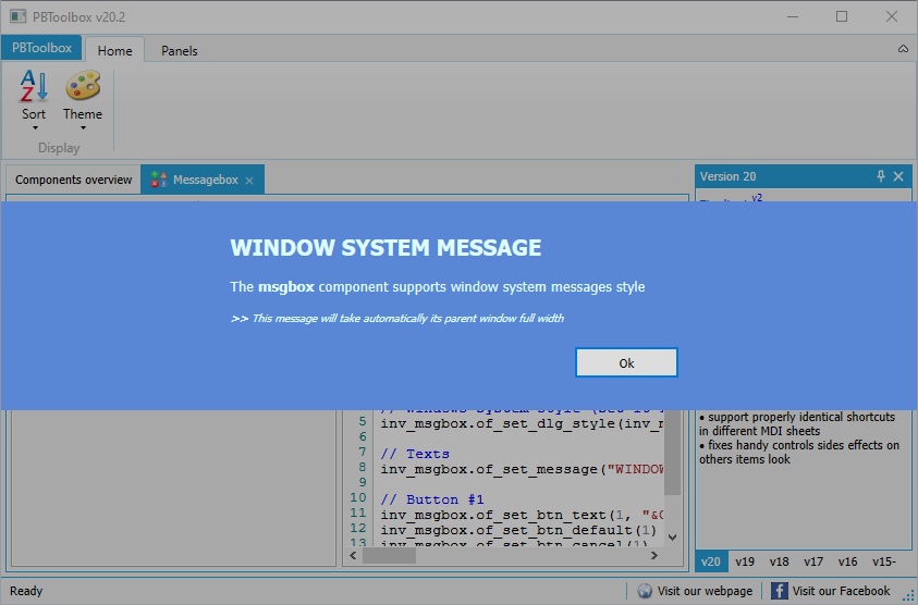 | UPGRADE Messagebox v2 • can center messagebox in the parent window or in the screen Statictext v3 • new layout : SCROLLABLE Tabctrl v3 • supports windows as tab items Tilesbox v2 • supports all themes Toolbarbox v3 • supports textboxes, checkboxes and radiobuttons as items • supports bars theme customization (background, border color and border thickness) |